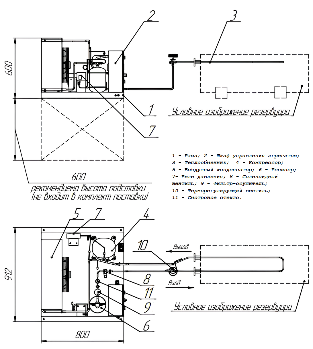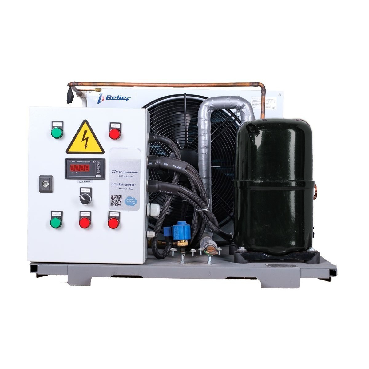 АПД-40,0 с выносным теплообменником: Эта модификация применяется для цистерн или резервуаров, не имеющих штатных теплообменников. Агрегат включает компрессорно-конденсаторный модуль и высокоэффективный пластинчатый теплообменник, где происходит конденсация паров диоксида углерода.